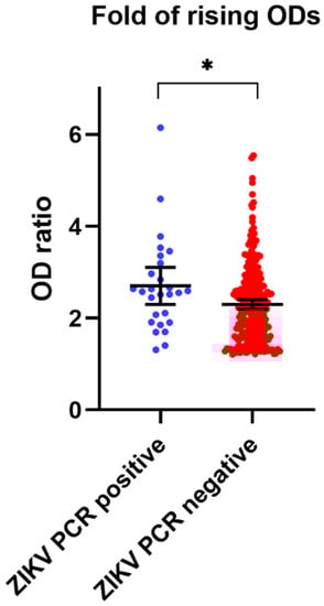 Rising OD folds between acute/convalescent serum samples. ZIKV NS1 IgG ELISA results of the analysis of 28 ZIKV (ZIKV RT-PCR confirmed) cases (blue) and 262 non-ZIKV infected persons (red). The OD ratio of the ZIKV group was statistically significantly different from that of the non-ZIKV group (* p = 0.022).