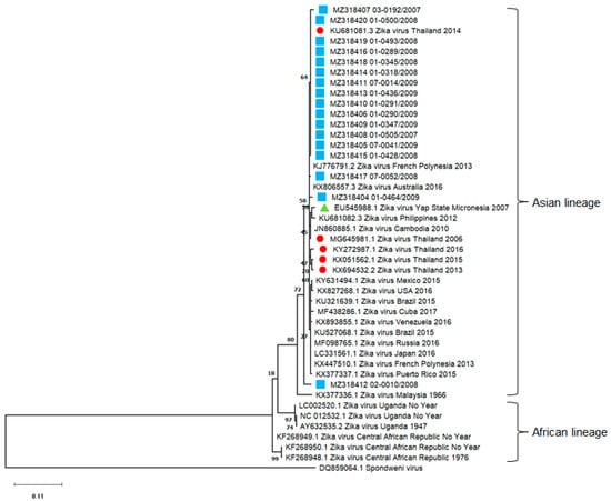 Phylogenetic analysis of ZIKV fragments (300 bp). The tree was constructed by using ZIKV sequences obtained from school-aged children in Ratchaburi province, Thailand, from 2007 to 2009 (blue square), ZIKV sequences from other studies in Thailand (red circle), ZIKV sequences (EU545988.1) from Yap Islands in Micronesia 2007 (green triangle). The maximum likelihood method with a bootstrap value of 1000 was applied. Sample names and nucleotide sequence accession numbers are marked with symbols. The Spondweni virus (DQ859064.1) sequence served as the out-group.