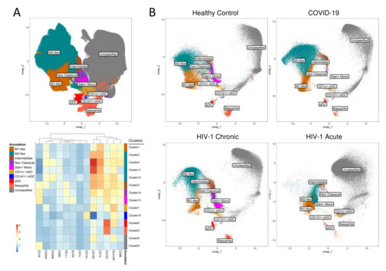 - Kazer, S.W.; Aicher, T.P.; Muema, D.M.; Carroll, S.L.; Ordovas-Montanes, J.; Miao, V.N.; Tu, A.A.; Ziegler, C.G.K.; Nyquist, S.K.; Wong, E.B.; et al. Integrated single-cell analysis of multicellular immune dynamics during hyperacute HIV-1 infection. Nat. Med. 2020, 26, 511–518. [Google Scholar] [CrossRef] [PubMed]