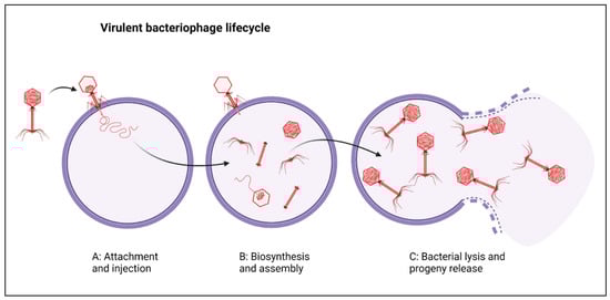 (A) Phage (depicted in red) attachment and injection of its genome into a host bacterium (circular purple cell). (B) Bacterial cellular machinery is used to synthesise and assemble new phage progeny. (C) Progeny are released due to bacterial cell lysis. Created with BioRender.com (31 May 2021).