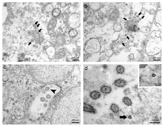 The results of immunohistochemistry of SARS-CoV-2 nucleocapsid proteins and subsequent correlative microscopy undoubtedly proved the presence of SARS-CoV-2 virions in the analysed human nasopharyngeal tissue (Figure 2). We detected cells with positive immunohistochemical staining in semithin sections by light microscopy (Figure 2a). The same cells with positive immunohistochemical staining were examined on ultrathin Epon sections, showing electron-dense material in the cytoplasm inside endosomes (Figure 2b,c). Finally, at higher magnification, we identified in endosomes of the observed cell virions marked with a fine granular electron-dense reaction corresponding to the product of DAB (Figure 2d).