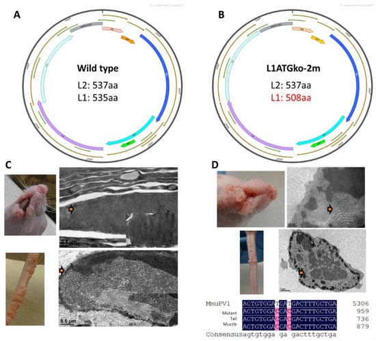 The mouse papillomavirus (MmuPV1) was first identified in an athymic nude mouse colony in 2011 []. Since then, MmuPV1 has been shown to infect both cutaneous and mucosal sites in mice [,,,,]. Abundant virions are produced, indicating that the complete viral life cycle occurs in these infected tissues [,,]. L1 and L2 of MmuPV1 share similar sequence homology with other human and animal papillomaviruses []. Theoretically, the MmuPV1 L1 protein can be encoded from any of the four N-terminal methionines (at the 1st, 2nd, 28th, and 30th amino acid residue, respectively) []. The third methionine at the 28th position incorporates the consensus motif (MxxWx7YLPP) for most L1s. An in vitro study demonstrated that MmuPV1 L1 proteins initiating from the 2nd methionine failed to form proper VLPs, but L1s starting from the 3rd and 4th methionine generated correctly formed VLPs in abundant quantities []. To further explore the role of L1 in the viral life cycle using this novel mouse model, we generated two L1 mutants. The first mutant, with the first two methionines abrogated (designated L1ATGko-2m) (Figure 1), would result in a protein of 508aa instead of 537aa if the protein were expressed from the next available (3rd) methionine. The second mutant, with all four methionines mutated (designated as LlATGko-4m), would result in a truncated protein of 362aa if the protein was expressed from the next available methionine.