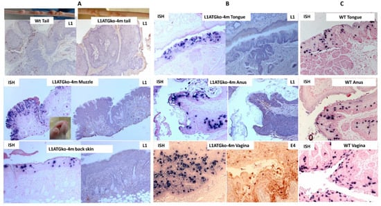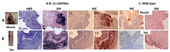 Since mutants with abrogation of the first two methionines displayed an infection pattern similar to that of the wild type, we generated the next L1 mutant with the first four start codons mutated from ATG to ACG and labeled the mutant L1ATGko-4m. The L1ATGko-4m mutant was tested at both cutaneous (Figure 2A) and mucosal (Figure 2B) sites. The cutaneous sites including the tail, muzzle, and back were found to be susceptible to infection by L1ATGko-4m, but the appearance of the cutaneous lesions was delayed, and lesions were smaller than those induced by the wild-type virus (Figure 2A). Viral DNA could be detected throughout the suprabasal epithelial layers in all cutaneous and mucosal sites (tongue, anus, and vagina) by in situ hybridization (ISH) (Figure 2A,B) as shown in wild-type lesions (Figure 2C). L1 expression was absent in the lesions by immunohistochemistry (IHC) using an in-house monoclonal antibody (MPV.B9) against full-length L1, thus confirming the absence of full-length L1 protein in the tissues (Figure 2A,B). We subsequently tested E4 protein expression using a polyclonal antibody. E4 expression could be readily detected, as shown in one example of infected vaginal tissues, indicating that early events in the viral life cycle were intact (Figure 2B). Therefore, L1 absence did not impact MmuPV1 infection negatively.
