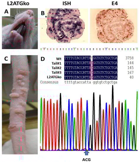 The L2ATGko mutant-induced tumor growth at tails of the nude mice. More tail lesions (C) than muzzle lesions (A) were detected. Viral DNA was detected in the suprabasilar epidermis of muzzle lesions by in situ hybridization (ISH), and viral E4 protein was detected in the same regions of the muzzle lesions by immunohistochemistry (IHC) (B, 20×). DNA extracted from tail lesions induced by the L2 mutant maintained the ATG–ACG mutation. Input L2ATG mutant DNA was aligned with the amplified DNA from lesions (D).