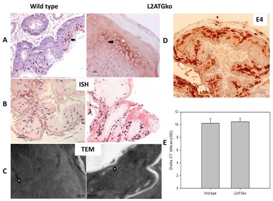 L2 is not required for L1 expression but influences L1 location. L1 expression in L2ATGko mutant lesions was mild–moderate and predominately present in the cytoplasm, while the wild-type lesions demonstrated moderate nuclear expression (A, 20×) although a comparative amount of viral DNA was detected (B, 10×). In addition, one of the two tail lesions exhibited viral particles by EM (arrows), although detection required exhaustive searching; wild-type lesions contained far more abundant viral particles (C). The cytoplasm of suprabasal epidermal cells was strongly positive for viral E4 protein in the L2ATGko mutant-induced lesions (D). Biopsies were harvested from lesions induced by the L2ATGko mutant or wild-type MmuPV1 for DNA extraction. No significant difference was found in the DNA copy number from the wild-type lesions and L2ATGko lesions (E, p > 0.05, unpaired Student’s t-test).