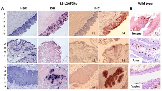 Three mucosal sites (vagina, tongue, and anus) infected with the L1-L2ATGko mutant demonstrated strong viral DNA and E4 expression but absence of L1. Viral DNA positivity was detected in the vaginal tracts and oral cavities of the infected animals of the L1-L2ATGko mutant (A, ISH, 20×, and arrows). L1 was undetectable in these tissues by immunohistochemistry (IHC) with MPV.B9 (A, 10×). However, all infected tissues showed intracytoplasmic E4 expression ranging from multifocal and light (anus) to more extensive and strongly positive expression (tongue and anus) (A). L1 expression is scattered but marked in wild-type MmuPV1 infected tissues by MPV.B9 in the nuclei of infected cells (B, 20×).