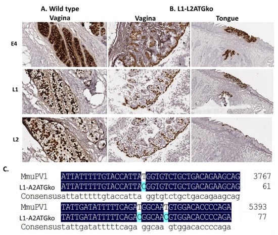 Mouse papillomavirus (MmuPV1) DNA was detected in both cutaneous (A) and mucosal (B) sites of animals infected with the L1ATGko-4m mutant. Viral capsid protein L1 was strongly positive in the wild-type MmuPV1-induced tail lesion (A, left L1, 20×) but not in the L1ATGko-4m mutant-induced tail lesion (A, right L1, 20×) by immunohistochemistry (IHC). Full-length L1 was also absent in other lesions including the muzzle, back skin, anus, and tongue initiated by the L1ATGko-4m mutant by MPV.B9 (L1 panel). Viral DNA expression was strongly positive in representative muzzle lesions (A, 20×), back skin (A, 20×), tongue (B, 20×), anal tract (B, 20×), and vaginal tract (B, 20×) by in situ hybridization (ISH), as shown in wild-type tissues (C, 20×). Interestingly, E4 was moderately to strongly cytoplasmic positive within the vaginal epithelium by immunohistochemistry (IHC) using an in-house rabbit polyclonal antibody against the mouse papillomavirus E4 protein (B, 20×).