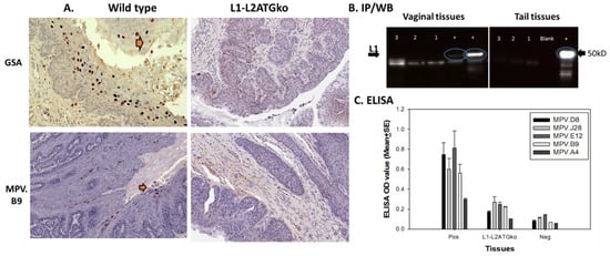 Frozen tail and vagina tissues were crushed with a hammer while in liquid nitrogen and transferred to immunoprecipitation (IP) buffer (20 mM Tris HCL, pH 8, 137 mM NaCl, 1% Nonidet P-40, 0.1% SDS, 2 mM EDTA) with Protease and Phosphatase Inhibitor Cocktail (Thermo Fisher, Waltham, MA USA, USA) added just before use. Protein concentration was determined with a BCA Protein Assay kit (Thermo Fisher Pierce, Waltham, MA USA). Then, 10 µg vagina positive control and 40 µg L1-L2 ATGko protein (3 separate samples) were run on a Novex WedgeWell 4–20% Tris-Glycine Gel (Thermo Fisher Invitrogen, Waltham, MA, USA) and transferred to a PVDF membrane (Merck Millipore, Burlington, MA, USA). MPV.B9 (1:200) and Anti-mouse IgG1 HRP (Thermo Fisher Pierce, Waltham, MA, USA) were used to probe for L1 in Western blot analysis. An IP/Western was also conducted for the tail tissues. Then, 25 µg positive control and 3 separate L1-L2ATGko samples were incubated overnight at 4 °C with 2 µg MPV.A4 mab with end over end mixing. Then, 20 µL protein A/G agarose beads were added for 1 h followed by 4 washes of the pellets with IP buffer. The samples were run and probed as described above. Protein loading controls were confirmed by Coomassie stain (data not shown).