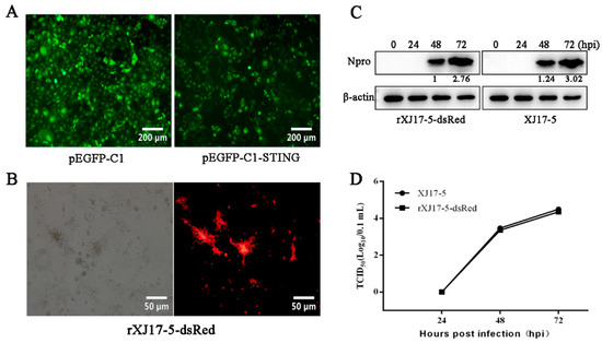 Porcine STING stable Marc-145 cells and characterization of the rescued rXJ17-5-dsRed PRRSV. (A) Porcine STING stable Marc-145 cells (right) and vector pEGFP-C1 control stable Marc-145 cells (left) obtained by G418 selection. (B) Marc-145 cells were infected with rXJ17-5-dsRed PRRSV at a MOI of 0.1, with cytopathic effect (CPE) and dsRed expression at 48 h post infection (hpi). (C,D) The in vitro growth kinetics of the cloned rXJ17-5-dsRed virus and the parental XJ17-5 virus. Marc-145 cells were infected with PRRSV at a MOI of 0.1. The growth curve of both PRRSVs in Marc-145 cells within 72 hpi were determined by Western blotting (C) and TCID50 assay (D). The values of PRRSV N protein (Npro) quantification by gray scanning were shown below the bands following normalization by β-actin.