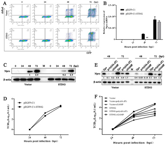 The replication of PRRSV in porcine STING stable Marc-145 cells with or without stimulations. (A–D) The STING or vector control stable Marc-145 cells seeded in 24-well plates were infected with rXJ17-5-dsRed at a MOI of 0.1, for 0, 24, 48, 72 h, and then assayed by flow cytometry (A), RT-qPCR (B), Western blotting (C) and TCID50 (D). The dsRed/GFP double signal represents that those Marc-145 cells stably expressing STING or control GFP were infected by rXJ17-5-dsRed. (E,F) Marc-145 cells stably expressing STING or control GFP grown in 24-well plates were stimulated by transfection of poly (dA:dT) (1 μg/mL) or 2′3′-cGAMP (1 μg/mL) for 24 h using transfection reagent lipofectamine 2000 (lipo). Then, the cells were infected with PRRSV at a MOI of 0.1, for 24, 48, and 72 hpi, respectively. The infected cells were assayed by Western blotting (E) and TCID50 (F). ** p < 0.01 versus the vector pEGFP-C1 control groups.