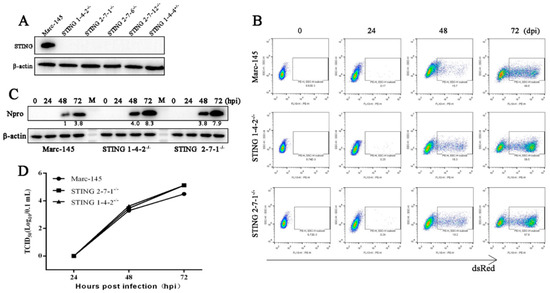 The replication of PRRSV in STING−/− Marc-145 cells. (A) Detection of STING protein expression in 4 STING−/− Marc-145 cell clones and 1 STING+/− Marc-145 cell clone by Western blotting. (B–D) Two STING−/− cell clones and control Marc-145 cells in 24-well plates were infected with rXJ17-5-dsRed at a MOI of 0.1. Cells were harvested at 0, 24, 48, and 72 hpi, and analyzed by flow cytometry. The dsRed signal represents the Marc-145 cells infected by PRRSV (B). The expression of PRRSV N proteins (Npro) was detected by Western blotting (C). Viral titers in the supernatants were assayed by TCID50 (D).