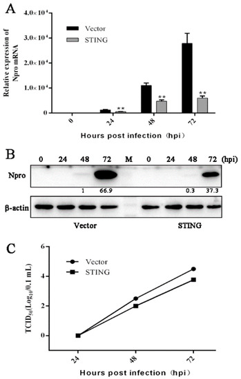 The PRRSV replication in porcine macrophages transfected with porcine STING. (A–C) CD163-PAMs seeded in 24-well plates were transfected with porcine STING or vector pmCherry-C1 (0.25 μg each) using lipofectamine 2000. At 24 h post transfection, the cells were infected with PRRSV at a MOI of 0.1, for 0, 24, 48, and 72 h, respectively. The infected cells were then assayed by RT-qPCR (A), Western blotting (B) and TCID50 assay (C). ** p < 0.01 versus the vector control groups. The values of PRRSV N protein (Npro) quantification by gray scanning were shown below the bands following normalization by β-actin.