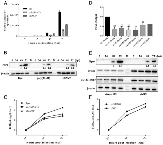 The PRRSV replication in porcine macrophages treated with agonists for cGAS-STING or with STING siRNA. (A–C) CD163-PAMs grown in 24-well plates were stimulated by transfection of poly (dA:dT) (1 μg/mL) or 2′3′-cGAMP (1 μg/mL) using lipfectamine 2000 (lipo) for 24 h. Next, the stimulated cells were infected with PRRSV at a MOI of 0.1, for 0, 24, 48, and 72 h, respectively. The infected cells were assayed by RT-qPCR (A), Western blotting (B) and TCID50 (C). (D–F) CD163-PAMs in 24-well plates were transfected with the indicated siSTING or siNC by lipofectamine 2000 for 48 h, and STING gene expressions were quantified by RT-qPCR (D). CD163-PAMs were treated by transfection with siNC, and siSTING-529, respectively, for 48 h, followed by infection with PRRSV at a MOI of 0.1. Cells were harvested at 0, 24, 48, and 72 hpi, and the indicated proteins were detected by Western blotting (E). Viral titers in the supernatants were assayed by TCID50 (F). * p < 0.05, ** p < 0.01 versus the lipo/siNC control groups.