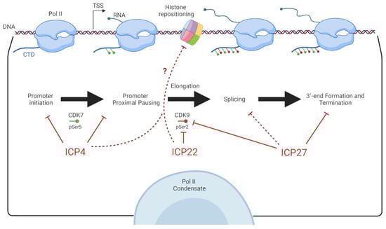 As mentioned in the previous section, polymerases are productively released from promoter-proximal pausing due to the kinase subunit of P-TEFb, cyclin-dependent kinase 9 (CDK9), which phosphorylates DSIF, NELF, and Ser2 of the CTD. It is important to note that other Ser2 kinases exist, and blocking CDK9 can also affect their downstream recruitment [36]. Still, activities of these enzymes have not yet been directly explored in HSV infection. A specific loss of Ser2 phosphorylation (pS2) in infected Vero cells was observed by Western blot, and this required ICP22 [47,48]. Interestingly, work from another group indicated that pS2 is downregulated by ICP27 in HeLa cells [49]. Though these studies varied in cellular contexts and methods such as soluble protein vs. total cell lysates, these findings can be reconciled by the model that ICP22 inhibits CDK9′s ability to phosphorylate Ser2. At the same time, ICP27 promotes the degradation of hyperphosphorylated RPB1. Recently, it was found that phospho-Ser7 (pS7) is down-regulated in addition to pS2 while the other major CTD modifications are preserved. Both ICP22 and ICP27 seemed to contribute to this loss in fibroblasts [50]. This may occur by the same means as the reduction of pS2 in infection, though pS7 loss was not observed with transient expression of ICP22 in HeLa cells [51]. Downregulation of pS7 may result from CDK9 inhibition evolved around pS2. However, there may be other impacts on CTD regulation caused by pS7 loss, as this mark stimulates CDK9 activity on other CTD residues in vitro [52]. Both pS2 and pS7 recruit the Integrator complex to terminate non-polyadenylated transcripts such as Pol II-derived snRNA and replication-dependent histone mRNA, but Integrator has also been shown to be a global regulator of promoter-proximal pausing [53] and is regulated during stress conditions to induce termination defects of mRNA [54]. Thus, clarifying the significance of pS7 loss and Integrator function during infection may illuminate novel regulation.