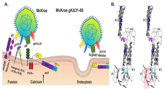 (A) Models of HSV-1 entry into host cells. The schematic depicts the interaction of viral glycoproteins gD, gH/gL, and gB with their cognate cellular receptors (HVEM (gD), nectin-1(gD), Integrins (gH/gL), PILRa (gB) and AKT (gB)). Membrane fusion is mediated by gB and regulated by complex protein interactions among gD, gH/gL, gK/UL20, and cellular receptors (left side). Deletion of the amino-terminal 31–68 aa of gK in the HSV-1 (McKrae), gKΔ31–68 virus prevents translocation of AKT to extracellular spaces and interaction with gB. This results in inhibition of virus entry via membrane fusion while allowing entry through receptor-mediated endocytosis (right side) []. (B) The predicted secondary structures of wild-type gK and gKΔ31–68 are shown (highlighted region depicts the actual deletion) oriented with the amino-terminal portion of gK proximal to cellular membranes. #1, #2, #3 and #4 corresponds to different domains of gk. The green arrows point to the predicted N-glycosylation sites. The conserved alpha-helical membrane-spanning domains, as well as the alphahelical domains conserved in the carboxyl-terminus of gK, are shown. Magenta and Cyan colors correspond to the alignment of gKs specified by HSV-1, HSV-2, Varicellar Zoster virus (VZV), and pseudorabies virus (PRV), as detailed previously []. Asterisk indicates YTK sequence in domain 2.