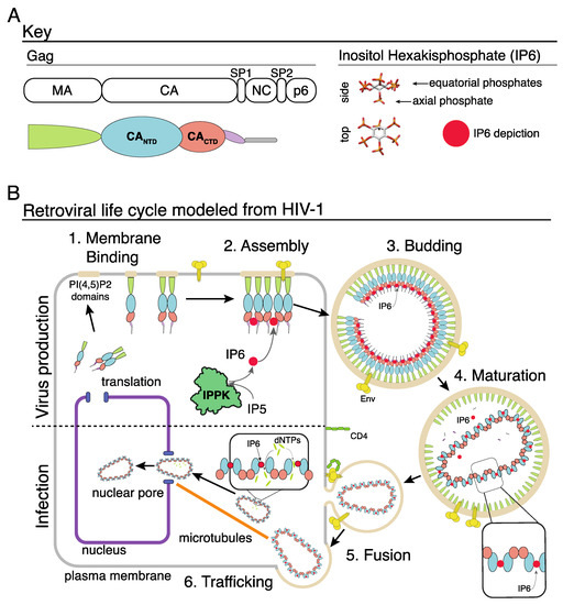 IP6 and the retroviral life cycle. (A) Key of the HIV-1 Gag domains on left. Right shows the d-myo-IP6 molecule. (B) 1: Gag protein interacts with the inner leaflet of the cellular plasma membrane. 2: Interactions between Gag, the plasma membrane, nucleic acid, and IP6 result in the assembly of the immature Gag lattice. 3: Assembled virion buds from cell with IP6 bound to two rings of six lysine residues at the Gag hexamer interface. 4: Retroviral protease cleaves the Gag protein, resulting in the liberation of the CA domain. CA interacts with IP6 via a ring of six arginine residues in the CANTD hexamer interface, which leads to the formation of the mature core. 5: Interaction between the viral Env protein and the cell receptor (CD4 in this example) results in fusion, and release of the viral core into the cell cytoplasm. 6: Trafficking of the viral core along microtubules to the nuclear pore. Once in the cytoplasm, dNTPs enter the capsid core where they “feed” reverse transcription of the viral RNA genome into double-stranded DNA. Once at the nuclear pore, or inside the nucleus, the capsid core breaks open, releasing the integration complex.