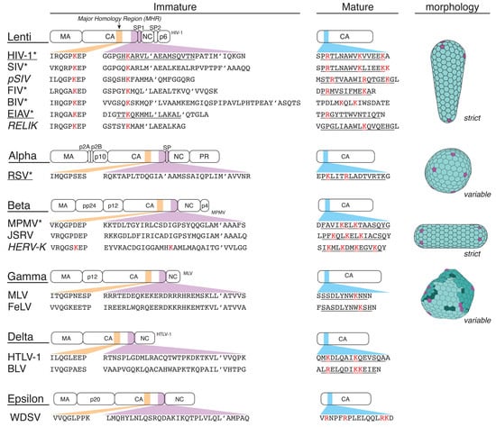 Retrovirus sequence comparison. The immature IP6 binding site in Lentiviruses in the MHR and CACTDSPNC region (immature) and CA helix 1 (mature). Lys (K) and Arg (R) residues that are at or near known IP6 binding sites are in red. Simplified morphologies shown are on the right; conical, spherical, cylindrical, nested cores (layering). A minimum of one sequence is displayed for each retrovirus. * = retroviruses with reported IP6-related phenotypes. Italics = endogenous retroviruses. Underlined = retroviruses with solved structures with an IP6 interaction. Underlined amino acid sequences correspond to known alpha-helical structures.