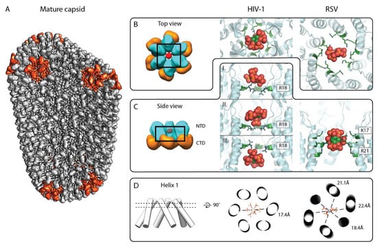 In immature retrovirus Gag assemblies, the positively charged residues required to coordinate IP6 in the hexamer center seem to be predominantly found in the Lentivirus genus. In contrast, a putative IP6 binding site in mature CA cores appears to be conserved among different retroviral genera. Specifically, positively charged residues (either lysines or arginines, or both) are present within helix 1 (or adjacent regions) of almost all orthoretroviruses (Figure 3). Proof for such a conserved role of IP6 outside the lentiviruses genus was recently provided by a study on the mature alpharetrovirus RSV. A structure of the mature RSV CA hexamer solved from CANC tubes, which were assembled in vitro in the presence of IP6, showed a density in the center of the hexamer pore [37], where it is coordinated by a ring of six lysines (K17 in RSV CA) and six arginines (R21 in RSV CA) (Figure 4B–D right panel). The density suggested that the IP6 molecule is oriented “on edge” with the equatorial phosphates pointing up and down in the pore, which contrasts with the “flat” orientation of IP6 in HIV-1 CA.