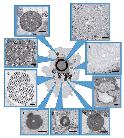 At late times (~24 hpi), virus particles and protein crystals formed by penton base and fiber start to appear [28,29] (Figure 1B). At 36 hpi, particle production reaches its maximum [30] (Figure 1G) and the cell morphology is extensively altered. The nuclear membrane adopts an irregular outline or proliferates abnormally forming lobes (Figure 1C), and cell chromatin is pushed towards the nuclear border to be excluded from viral RCs [31,32,33]. Nucleoli are compacted (Figure 1D) and many structures containing viral components appear: compact rings (RNA and packaging protein IVa2) (Figure 1E), electro-dense (Figure 1F) and electron-lucent inclusions (hexon, penton, IVa2, L1 52/55 kDa, and IX) [27,34,35,36,37,38,39]. Electron-dense granules (Figure 1H) containing viral RNA, protein VII and viral genomes were found in the clusters of interchromatin granule and in the PRZ [9,27]. Finally, speckled bodies (SB) accumulate genomes and core proteins which have failed to be encapsidated (Figure 1I) [27].