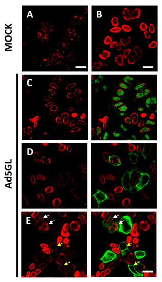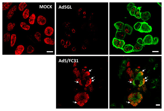 Labeling with two doses of BrdU. Confocal planes showing HEK293 cells uninfected (MOCK) or infected with Ad5GL or Ad5/FC31 at MOI = 50, as indicated. BrdU (25 µg/mL) was added first at 18 and then at 25 hpi. The cells were observed at 36 hpi. Red: BrdU, green: GFP labeled with anti-GFP antibodies in Ad5GL, GFP expressed by the virus in Ad5/FC31. See Section 3.5 for details about GFP labeling. White arrows point to concentric rings. Scale bar 10 µm.