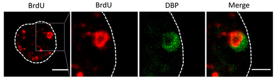 Double labeling for BrdU (red) and DBP (green) in cells infected with Ad5/FC31. The dotted line indicates the cell contour, and the square points out the magnified area in the following panels. Bar: 5 μm (left panel) and 2.5 μm (right panel).