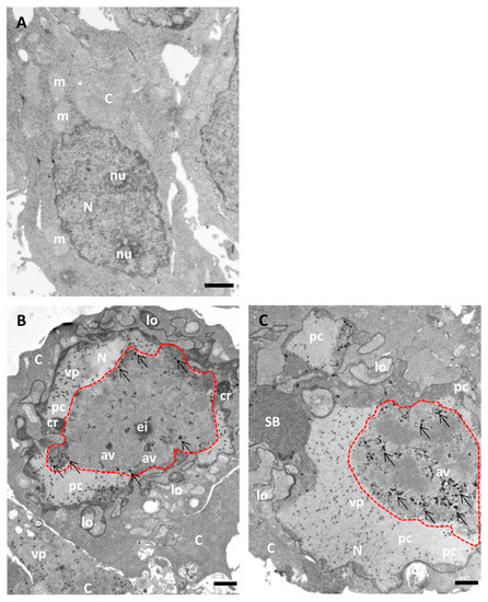 Morphology of AdV-infected cells without BrdU incorporation (for comparison with Figure 7). HEK293 cells uninfected (A) or infected with Ad5GL (B) or Ad5/FC31 (C) in the absence of BrdU. Cells collected at 36 hpi. MOI = 5 (similar structures were observed with MOI = 50). Nucleus (N), nucleolus (nu), cytoplasm (C), lobes (lo), compact ring (cr), electro dense inclusion (ei), protein crystal (pc), array of virus particles (av), viral particles (vp), speckled body (SB), mitochondria (m), replication center (red dotted line), and electron-dense granules (arrows). Scale bars 1 μm.