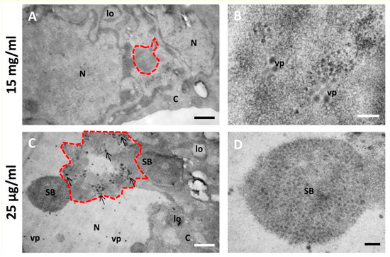Effect of different BrdU concentrations on the morphology of AdV-infected cells. (A,B) Cells infected with Ad5/FC31 and incubated with two doses of BrdU at 15 mg/mL. (C,D) Cells infected with Ad5/FC31 and incubated with two doses of BrdU at 25 µg/mL. Cells collected at 48 hpi, MOI = 5 (similar structures were observed at MOI = 50). Nucleus (N), cytoplasm (C), lobes (lo), viral particles (vp), speckled body (SB), replication center (red dotted line), and electron-dense granules (arrows). Scale bars 800 nm (A,C) and 200 nm (B,D).