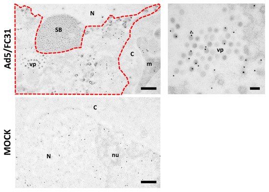 BrdU labeling for freeze-substituted samples. HEK 293 cells infected with Ad5/FC31 (MOI 50), or uninfected, as indicated. BrdU (25 µg/mL) was added at 18 and 25 hpi. The cells were fixed at 48 hpi. Nucleus (N), nucleolus (nu), cytoplasm (C), viral particles (vp), speckled body (SB), mitochondria (m), replication center (red dotted line). Scale bar: 500 nm in the left panels, 100 nm in the right hand side panel.