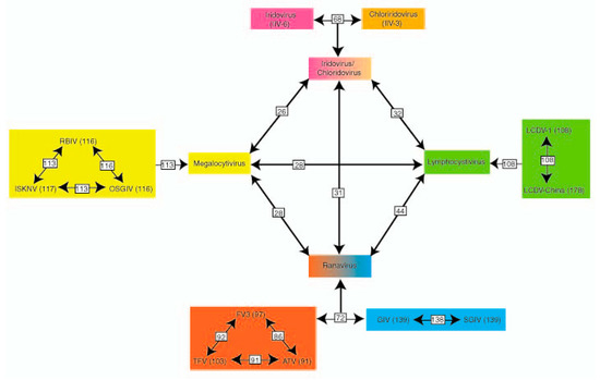 Phylogenetic relationships between iridovirus genera (shown in different colors) based on gene content (Eaton et al., 2007). Phylogenetic relationships between the five iridovirus genera based on gene content. The viral species were compared within a genus to identify the number of orthologous genes. Orthologous genes between viral genera were then specified. The numbers on each line identify the number of orthologous genes shared among viral species or genera comprising the 26 core genes. The Iridovirus and Chloriridovirus genera have a high level of gene conservation and a shared genera box (Iridovirus/Chloriridovirus) was used to compare orthologous genes between genera.