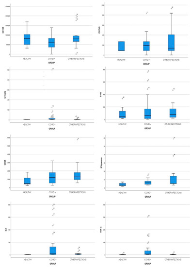 Analyzing cytokine levels in the different groups, we observed that in Group 1 some patients had extremely high values of IL-1β, CD25, IFN-γ, IL6, and TNF-α. We therefore created a subgroup comprising these patients that we classified as “COVID-plus”. Comparing the levels of these cytokines in the COVID-plus group with the other three groups, statistically significant differences were found for IL-1β, CD25, IFN-γ, IL-6, and TNF-α (p < 0.05).