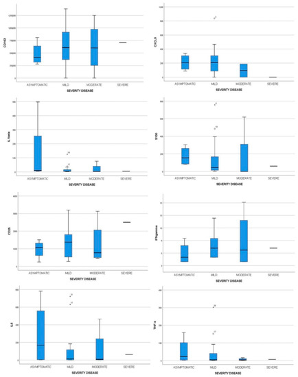 The diagnosis of SARS-CoV-2 was confirmed at admission to PED using a real-time reverse transcriptase polymerase chain reaction (RT-PCR) method on nasopharyngeal swabs. A Luminex xMAP system (Bio-Plex 200 System, Bio-Plex Manager Software 6.0, Bio-Rad Laboratories, Hercules, CA, USA), which is a multiplex ELISA-based immunoassay, was used to assess the levels of circulating cytokines. We used the Human Magnetic Luminex Screening Assay (BioTechne, Milano, Italy) which allows the simultaneous detection of the following circulating analytes: CD163, CXCL9, IL1β, S100b, cd25, IFNγ, TNF-α, and IL6.The assay was performed according to manufacturers’ instructions, and the concentrations were calculated by a software provided by the manufacturer using the standard curve (Bio-Plex Manager Software, Bio-Rad Laboratories, Hercules, CA). Serum samples were assayed in duplicate, and hemolyzed samples were removed from analysis according to vendor recommendations. We decided to test these cytokines as recognized reliable biomarkers in disorders that have inflammatory processes as a common basis and for their involvement in the “cytokine storm” [13,14,15].
