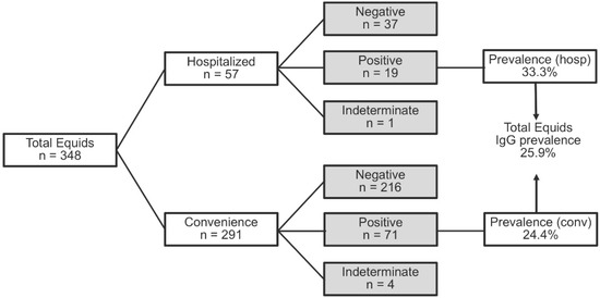 Of all samples tested, 90/348 equids tested IgG ELISA-positive and 5/348 had an indeterminate reading (Figure 1). ELISA results for anti-WNV-IgM were all negative with the exception of one indeterminate result, which was subsequently determined to be seronegative for all three flaviviruses by PRNTs (Table S1).