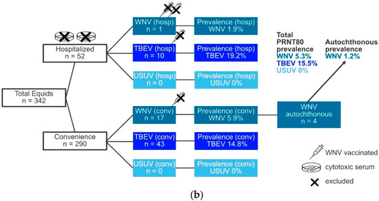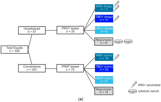 Laboratory results of PRNT-80: (a) IgG ELISA reactive or indeterminate samples tested with PRNT-80. Equids with cytotoxic serum, depicted by the symbol of a Petri dish, and WNV-vaccinated equids, depicted by the symbol of a syringe, are included. The number of symbols represents the number of equids; (b) Results of PRNT-80-positive samples are highlighted, negative samples are omitted. In two hospitalized horses, cytotoxic serum prohibited reliable neutralizing antibody analysis and they were therefore excluded, decreasing PRNT-80 group hosp to n = 55 and total equids (hosp + conv) to n = 346. Further subtracting WNV-vaccinated equids decreased equid numbers in hosp to n = 52, in conv to n = 290, and in total equids to n = 342. Abbreviations: PRNT = 80% plaque reduction neutralization test, WNV = West Nile virus, TBEV = Tick-borne encephalitis virus, USUV = Usutu virus, hosp = hospitalized equids, conv = convenience field sampled equids.