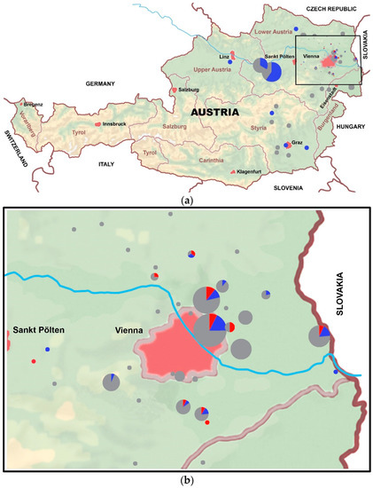 Maps of Austria showing the geographical locations using Google-derived GPS coordinates of the sampled equids (Google LLC, Mountain View, CA, USA). The size of the circles correlates with the number of equids sampled. Every equid is represented by the outcome of the highest reciprocal neutralizing antibody titer ≥ 20 (PRNT80). The colors represent neutralizing antibody status. Red represents WNV seropositive, blue TBEV seropositive, and grey flavivirus seronegative equids: (a) A map of Austria and neighboring countries. The inset highlights the greater Vienna area; (b) Close-up of Figure 3a (inset), highlighting the greater Vienna area.