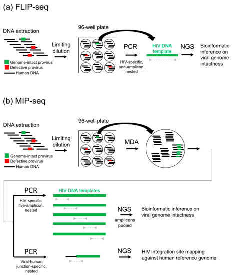 FLIP-seq and MIP-seq workflow. (a) FLIP-seq begins with DNA extraction (further discussed in Section 2), followed by limiting dilution to a single HIV-DNA template per subsequent PCR reaction (Section 3), near-full-genome single-amplicon HIV-DNA PCR amplification (Section 4), and finally next-generation deep sequencing (NGS) and bioinformatic inference on viral-genome intactness (Section 5). (b) Similar to FLIP-seq, MIP-seq begins with DNA extraction (Section 2), followed by limiting dilution to achieve single HIV-DNA template per subsequent reaction (Section 3), then multiple displacement amplification (MDA) by random primers. Resulting reaction is split for near-full-genome five-overlapping-amplicon HIV-DNA PCR amplification and viral-human junction amplification (Section 4), then subjected to NGS and bioinformatics inference on viral-genome intactness and mapping of viral-human DNA junctions against the human reference genome (Section 5). Note that MIP-seq would not yield full-length sequences of defective viral genomes that do not contain any of the primer binding sites targeted by the 20 primers used in the five-amplicon nested-PCR approach and was designed specifically to capture near-full-length HIV DNA that are approximately >8000 base pairs in length. A single-amplicon, near-full-genome PCR approach was not used in MIP-seq because it was markedly less sensitive due to the average amplification product lengths at the MDA step.