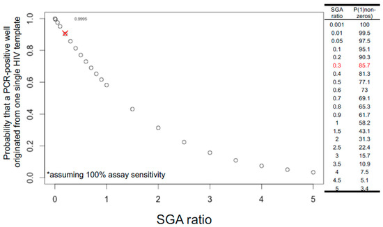 Probability that a PCR-positive reaction originated from one single HIV template follows Poisson probability distribution and decreases as SGA ratio increases. SGA ratio (x-axis) is defined as the number of expected positive reactions divided by the total reactions. For example, if ddPCR short amplicon estimation shows that there are 3 HIV-DNA copies per microliter within a nucleic acid extract, to achieve a limiting dilution at 1:3 (0.3) SGA ratio, one microliter of this extract would be distributed into 9 PCR reactions equally, yielding a probability of 85.7% (y-axis) that a given positive well is derived from one single HIV template (red cross in graph and red highlight in table). This calculation assumes 100% assay sensitivity in the amplification and detection of all input templates (asterisk).