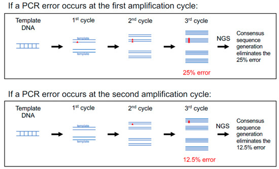 PCR errors are corrected via consensus sequence generation. Errors introduced during the PCR amplification step (red triangles) mainly involve single-base substitution errors at random locations. An error that occurs at an earlier PCR amplification cycle will carry over into a larger proportion within the final amplicon pool (25% if first cycle) relative to an error that occurs at a later amplification cycle (12.5% if second cycle). This figure illustrates that per error introduced, the maximum frequency of representation is 25% within the final amplicon pool, which can be corrected via consensus sequence generation of the deep sequence data.