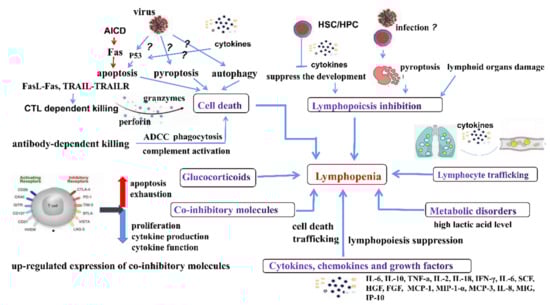 Lymphocytes are important elements of the immune system. They are categorized into T lymphocytes (T cells), B lymphocytes (B cells) and natural killer (NK) cells based on their migration, surface makers and biological functions [1]. Lymphopenia is the condition in which there is an abnormal reduced number of lymphocytes in the peripheral blood. It is diagnosed when a total lymphocyte number is lower than normal for a particular age group (for instance, less than 1000 cells/μL in older children and adults) [2,3,4]. Such obvious reduction in blood lymphocytes count occurs due to viral infections [5], chemical and physical lympho-depleting agents [6], autoimmune-related systemic diseases [7], genetic factors [8], cancers [9], sepsis [10] and other severe injuries [11]. Generally, most viruses lead to relative lymphocytosis, while only a few viruses causing severe disease could result in lymphopenia, such as severe acute respiratory syndrome coronavirus-2 (SARS-CoV-2) [12], ebola virus (EBOV) [13] and human immunodeficiency virus (HIV) [14]. Although numerous studies were attempted to reveal the causes of lymphopenia during viral infections, the mechanisms underlying it is still unclear. It is believed that the mechanism underlying lymphocyte depletion is more complicated as different factors or mechanisms are involved during the infection caused by different viruses. In this review, the current progress of the lymphopenia induced by viral infections with emphasis on RNA viruses is summarized and the mechanism and factors involved during various virus infection-mediated lymphopenia are discussed.