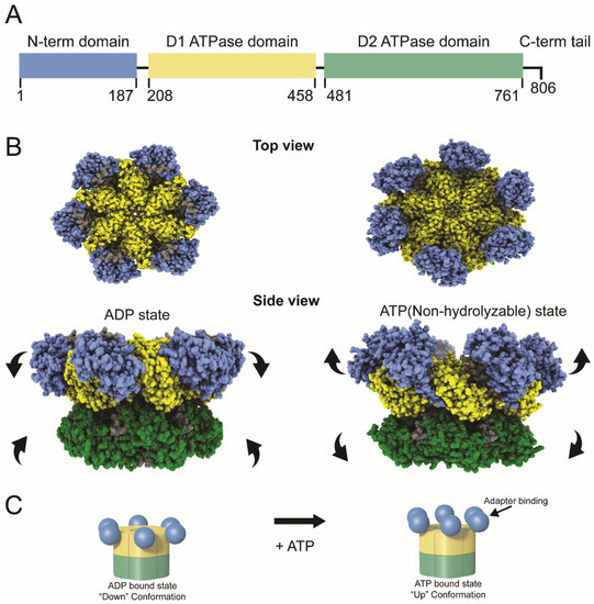 Each p97 is a homohexamer (Figure 1). The monomers are comprised of an N-terminal domain with multiple protein-binding sites and two AAA ATPase domains designated D1 and D2 [4]. The ATPase domains are highly similar in sequence and structure, yet they have distinct functions [4]. The D1 domain is essential for hexameric p97 assembly, whereas the D2 domain has the primary ATPase activity [8,9]. The D1 and D2 domains are connected by a short polypeptide known as the D1–D2 linker, and a flexible N-D1 linker joins D1 to the N-terminus [10] (Figure 1A). The p97 protein serves as an essential cellular chaperone, using its ATPase activity to drive protein unfolding [3,6]. Recent data suggest that VCP/p97 is responsible for unfolding of substrates by a hand-over-hand mechanism. The substrate is engaged by the N-terminal domain and pulled into a central pore formed by the D1 domains likely through sequential interaction with monomers and exits through the central pore of the D2 domains [11,12,13] The N-terminal domain interacts with a wide array of cofactors and adapters, but a few proteins bind to the C-terminal p97 tail [3,14,15]. ATP is known to affect the position of the N-terminal domains in the homohexamer, the “up” position associated with ATP binding and the “down” position with ADP binding [3] (Figure 1B). The “up” position often determines the ability of p97 to associate with protein adapters, such as the heterodimer, UFD1/NPL4 [16]. In turn, these adapters frequently bind to viral and cellular ubiquitylated proteins, which serve essential roles in protein–protein interactions and protein turnover.