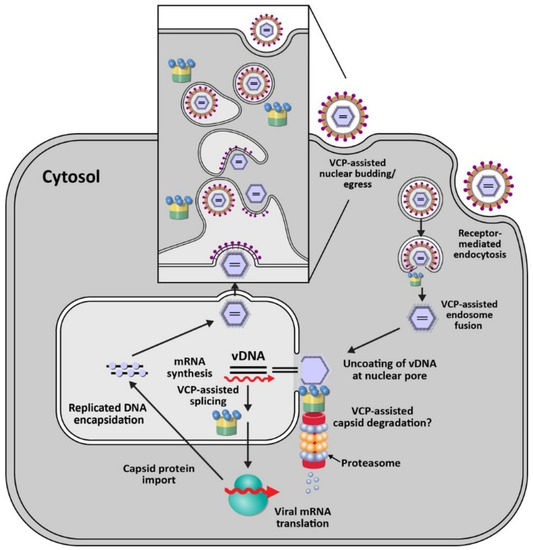 In addition to mammalian viruses, VCP has been reported to facilitate replication of the nucleopolyhedrovirus, AcMNPV, which belongs to the Baculoviridae family. Baculo-virus virions infect insects of the orders Lepidoptera, Hymenoptera, and Diptera and contain large, circular double-stranded DNA genomes [108]. After infection of Sf9 insect cells from the fall armyworm Spodoptera frugiperda, Lyupina et al. applied the reversible p97 inhibitor, NMS-873, at one-hour post-infection to bypass entry and nuclear transport of viral particles. The inhibitor treatment led to a dose-dependent inhibition of viral DNA replication, decreased viral protein levels, and virion particles [109]. Similar to herpesviruses, baculoviruses transcribe viral RNA and replicate their DNA within the nucleus [110]. The investigators proposed that the role of p97 in the baculovirus infection cycle involved the ubiquitin-proteasome system (UPS) and processing of ubiquitylated proteins within infected cells to relieve the stress associated with infection [109]. However, by analogy to herpesviruses, VCP may participate in the orderly progression of the baculovirus life cycle through disassembly of distinct viral-host complexes after entry as well as assembly (see Figure 3).