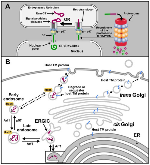 Trafficking of viral proteins represents another example of ERAD exploitation by viruses. For example, the betaretrovirus, mouse mammary tumor virus (MMTV), subverts ERAD and p97 for the trafficking of the Rem protein (regulator of export/expression of MMTV RNA) [149,150]. MMTV is a complex betaretrovirus that induces breast cancer and lymphomas in mice [149,151]. MMTV-encoded Rem is produced from a doubly spliced version of envelope mRNA and is synthesized as a 301-amino-acid precursor protein on the ER membrane in the same open reading frame as Env [149]. The Rem precursor is cleaved by signal peptidase into a 98-amino-acid N-terminal SP and a C-terminal glycosylated product, Rem-CT. A portion of uncleaved Rem is subjected to ERAD and accumulates in the presence of the proteasomal inhibitors MG132 and lactacystin [150] (Figure 4A). SP is cleaved from both Rem and Env proteins and is required for viral RNA export from the nucleus to the cytosol [149,152] as well as post-export processes likely to be involved in translation [153]. SP has nuclear import and export sequences as well as RNA-binding motifs, which allow binding to the Rem-responsive element near the 3′end of all viral mRNAs [149,153]. Trafficking of SP is assisted by VCP, suggesting that p97 provides the energy for ER membrane extraction [150,154].