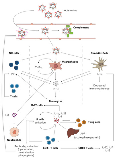 In an experimental model by Jie Tian et al., HAdV showed the ability to activate both pathways: in vitro, antibodies are needed to activate the classical pathway, but when injected in mice, antibodies played no significant role. The rise in plasma C3a, suggests the activation of complement is driven by an alternative pathway and other factors, including tissue damage [81]. A comprehensive description of the role of the cytokine and cell types involved in the HAdV immune response is provided in Figure 1.