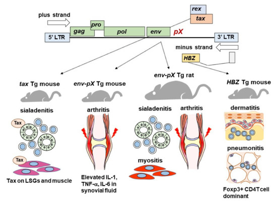 - Nakamaru, Y.; Ishizu, A.; Ikeda, H.; Sugaya, T.; Fugo, K.; Higuchi, M.; Yamazaki, H.; Yoshiki, T. Immunological hyperresponsiveness in HTLV-I LTR-env-pX transgenic rats: A prototype animal model for collagen vascular and HTLV-I-related inflammatory diseases. Pathobiology 2001, 69, 11–18. [Google Scholar] [CrossRef]