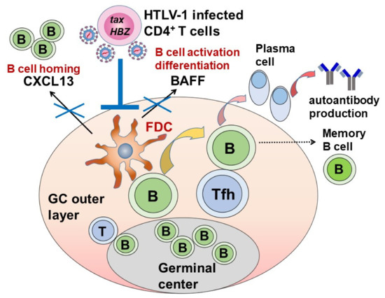 | HTLV-1 had an inhibitory function against follicular dendritic cells, and this function is a key component against autoantibody production system. |