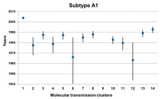 Molecular clock calculations of the time of the most recent common ancestor (tMRCA) for the 14 HIV-1 subtype A1 molecular transmission clusters (median, 95% HPD interval) where no cut-off was implemented for the proportion of the ARV-treated PLHIV within a cluster. Dots indicate the median estimations and horizontal lines the 95% HPD intervals.