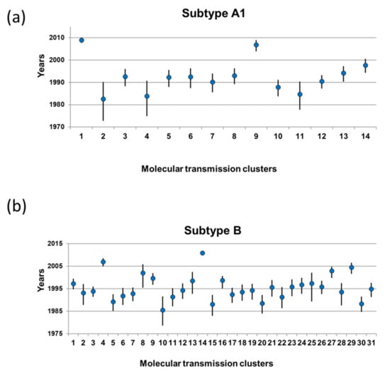 (a) Molecular clock calculations of the time of the most recent common ancestor (tMRCA) for the 14 HIV-1 subtype A1 molecular transmission clusters (median, 95% HPD interval). (b) Molecular clock calculations of the tMRCA for the 31 HIV-1 subtype B molecular transmission clusters (median, 95% HPD interval). Dots indicate the median estimations and horizontal lines the 95% HPD intervals.