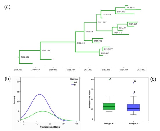 (a) Dated tree of the more recent molecular transmission cluster of subtype A1 (cluster 1), estimated by molecular clock analysis; (b) Distribution of transmission rates for the subtype A1 and B molecular transmission clusters; (c) Boxplots of transmission rates for subtype A1 and B molecular transmission clusters.