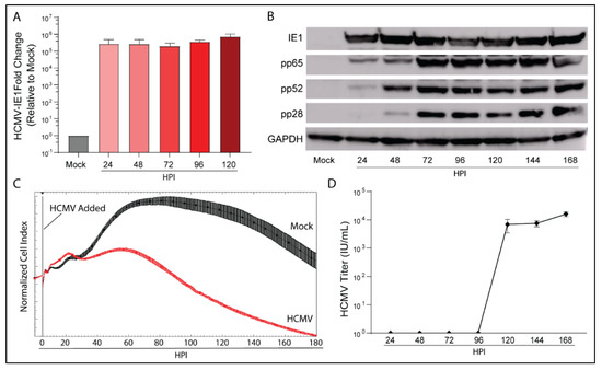All data are expressed as mean standard error of the mean (SEM) from at least three independent experiments. All data were analyzed using Prism 9 software (GraphPad; San Diego, CA, USA). Comparisons between mock and HCMV groups were assessed using unpaired t tests. Ordinary one-way analysis of variance followed by Dunnett’s multiple-comparison test was used to compare samples across time points. For all comparisons, a p < 0.05 was considered significant.