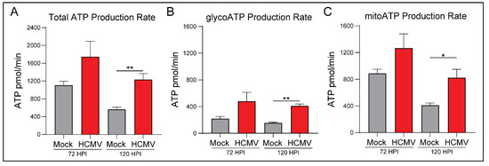 At 120 HPI, we witnessed a significant increase in total ATP production rate in HCMV infected cells (Figure 2A). Significant increases in both glycoATP (Figure 2B) and mitoATP (Figure 2C) production rates were also observed.