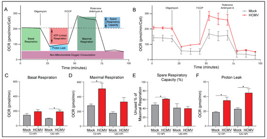 HCMV infection increases oxidative phosphorylation in LN-18 cells. (A) A cartoon illustrating how mitochondrial function was measured at 72 and 120 h post infection (HPI) using the Seahorse XFe24 MitoStress Kit. (B) Representative data output of LN-18 cells mock- or HCMV-infected at 72 HPI. (C) Basal Respiration, (D) Maximal Respiration, (E) Spare Respiratory Capacity, and (F) Proton Leak were derived from these measurements. All samples were normalized to cell number. Graphs represent pooled data from three independent experiments. Mean ± the SEM of at least 3 triplicates. *, p < 0.05.